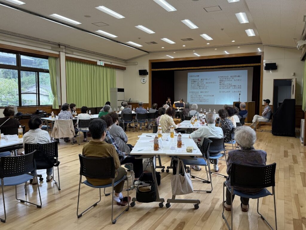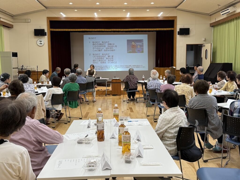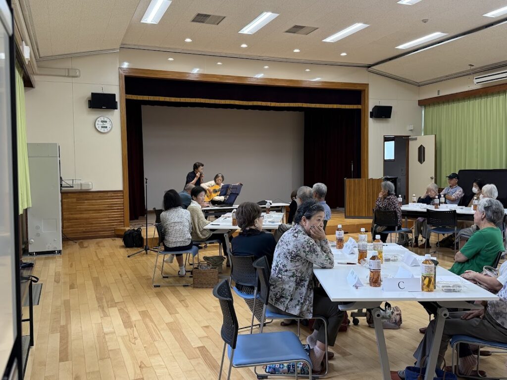 利用者様のギターと活動者様のハーモニカー演奏のコラボで懐かしい昭和の曲を参加者と唄いながら楽しみました。
